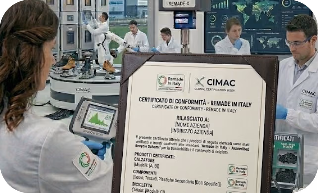 Diamo evidenza oggettiva al contenuto riciclato (es. Remade in Italy) e al poliestere riciclato (rPET), integrandoli nei tuoi documenti di prodotto.
